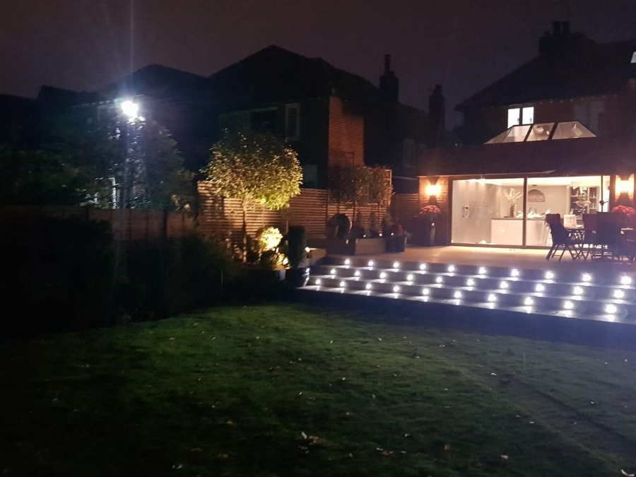 reclaimed scaffold board deck with batten fencing with warming lights.