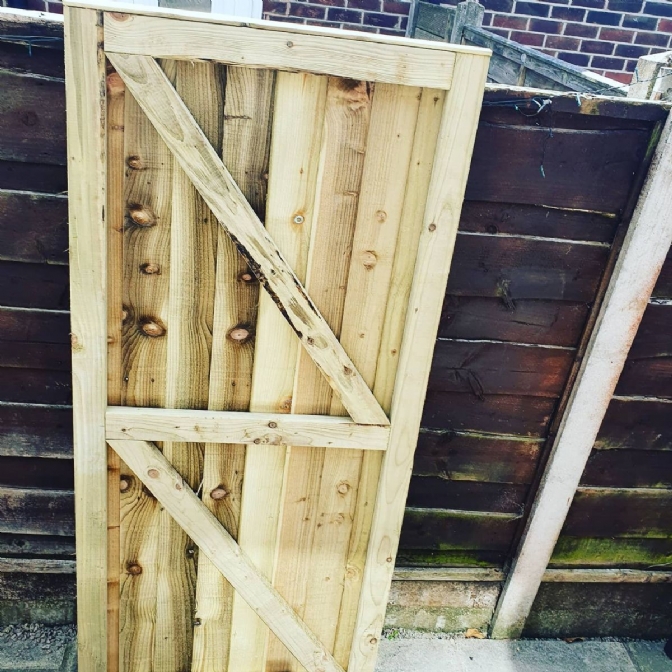 Nice batten fence and gate on a k rended wall in Ashton-under-Lyne