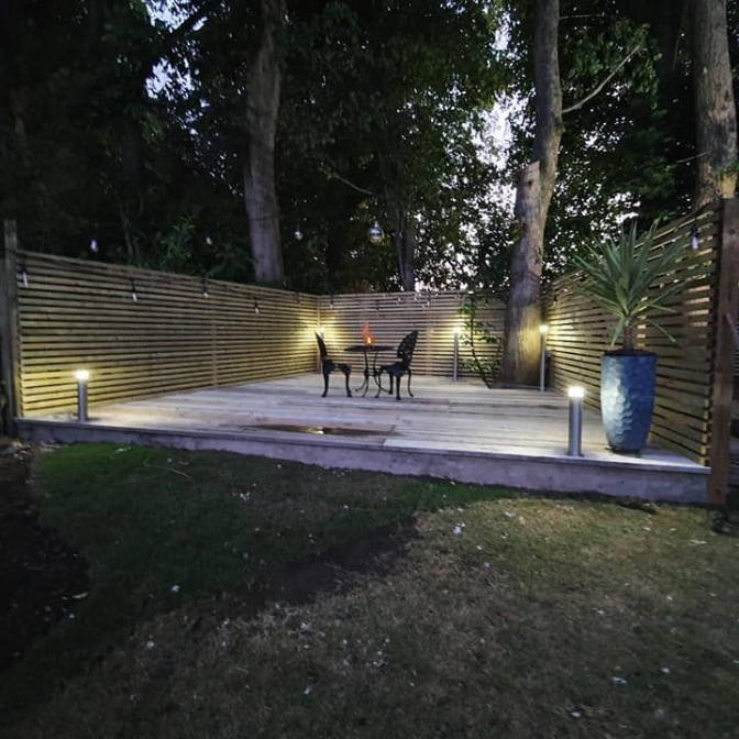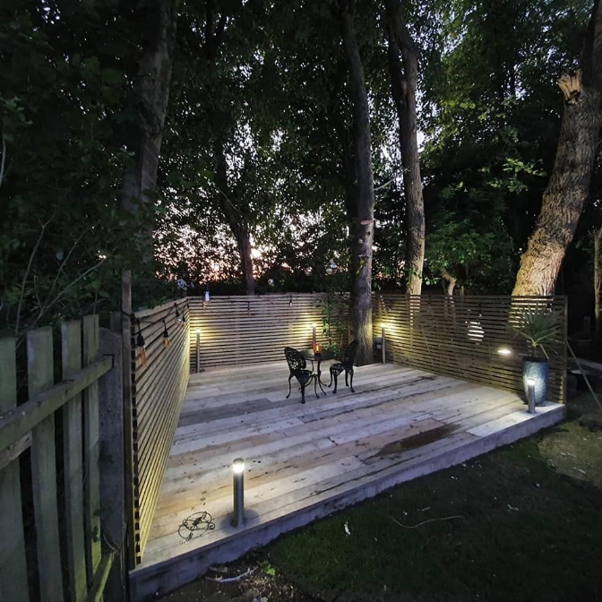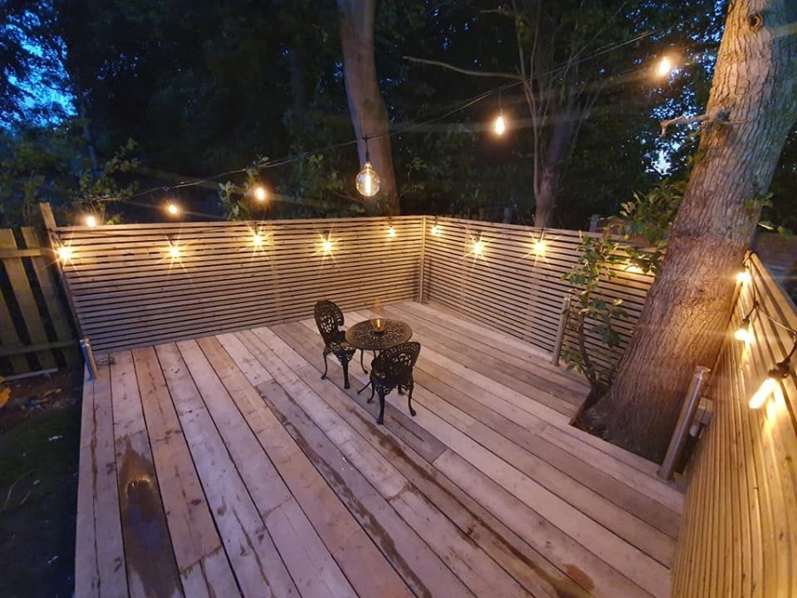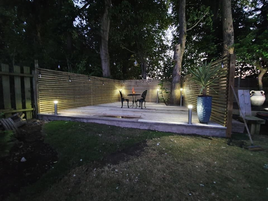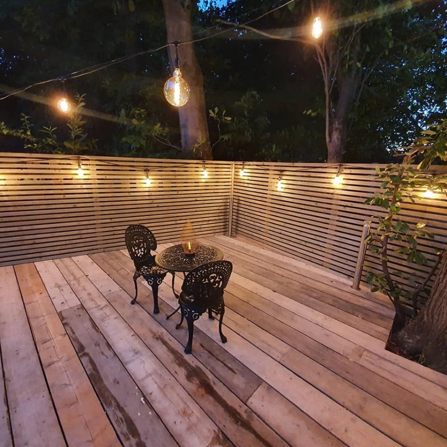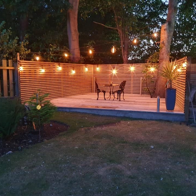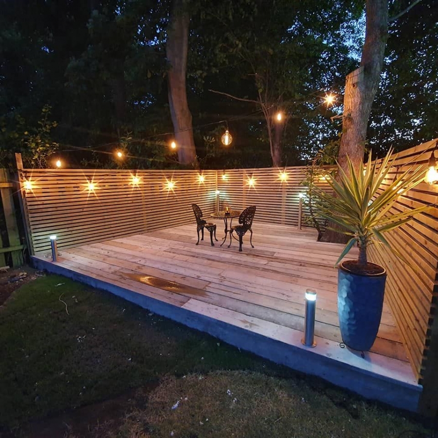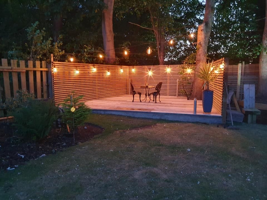A beautiful reclaimed scaffold board deck with batten fencing with warming lights. Customers are over the moon with what we have done