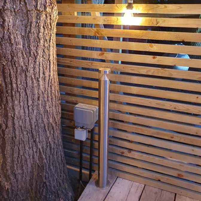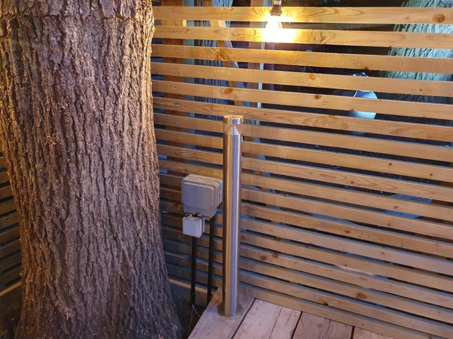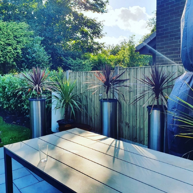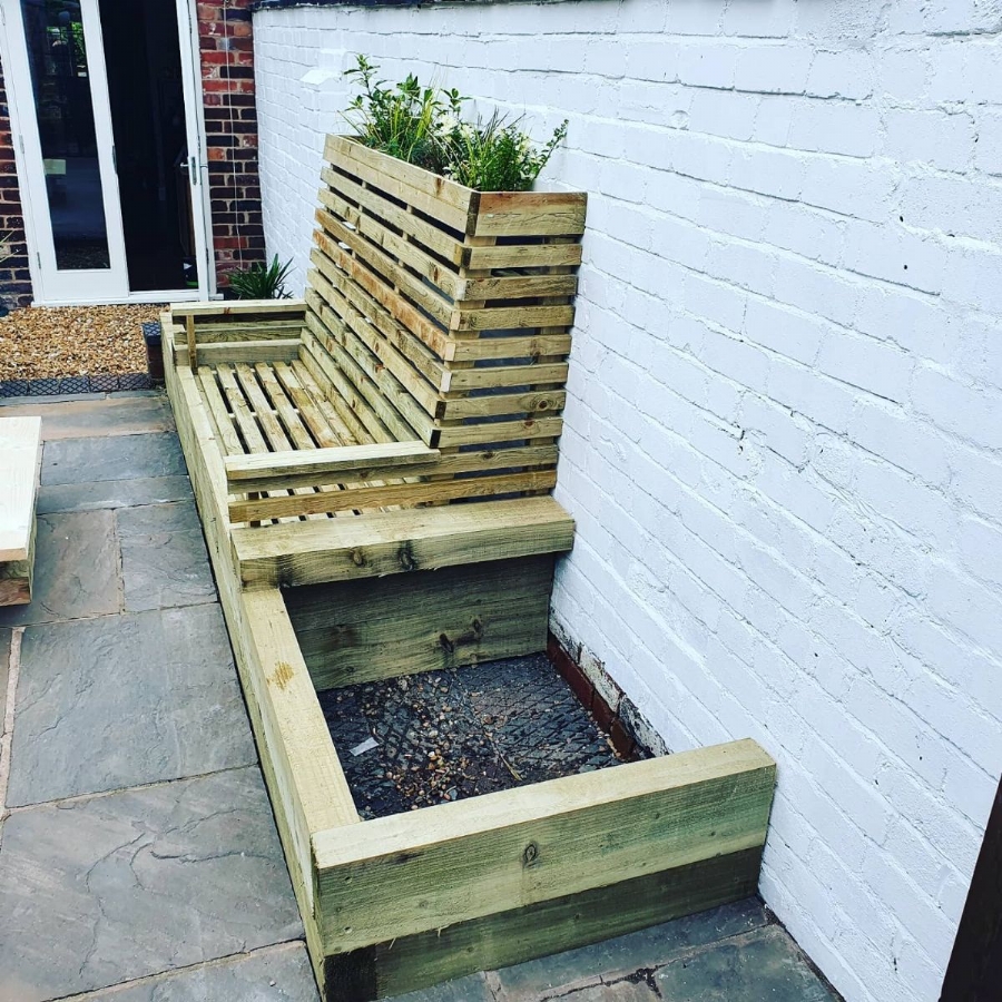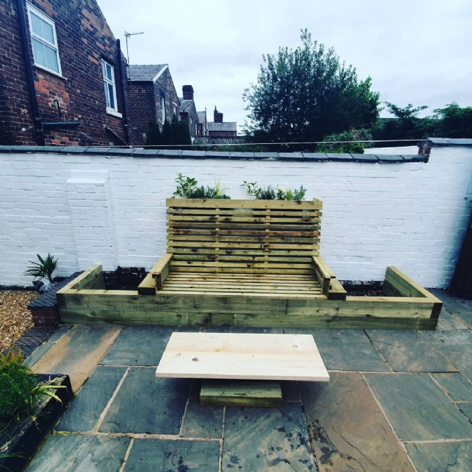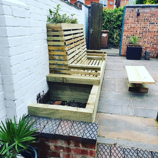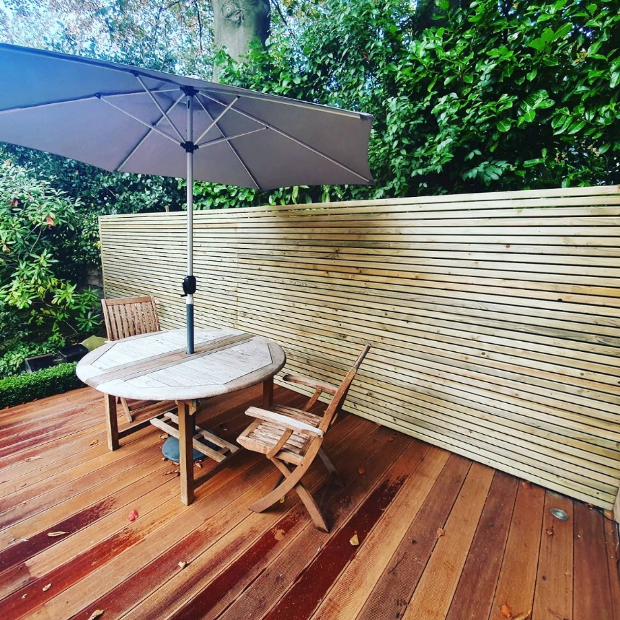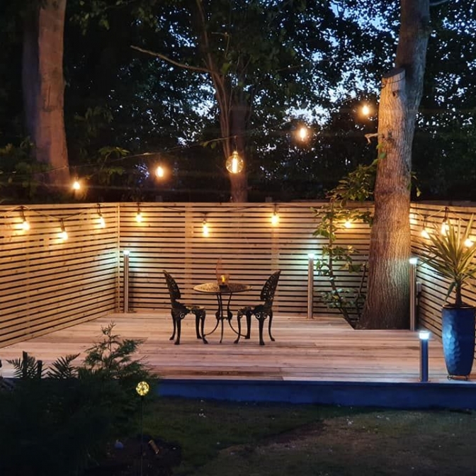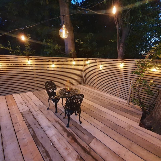 A beautiful reclaimed scaffold board deck with batten fencing with warming lights. Customers are over the moon with what we have done