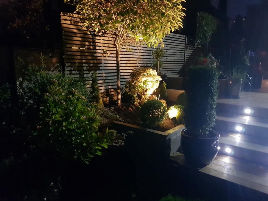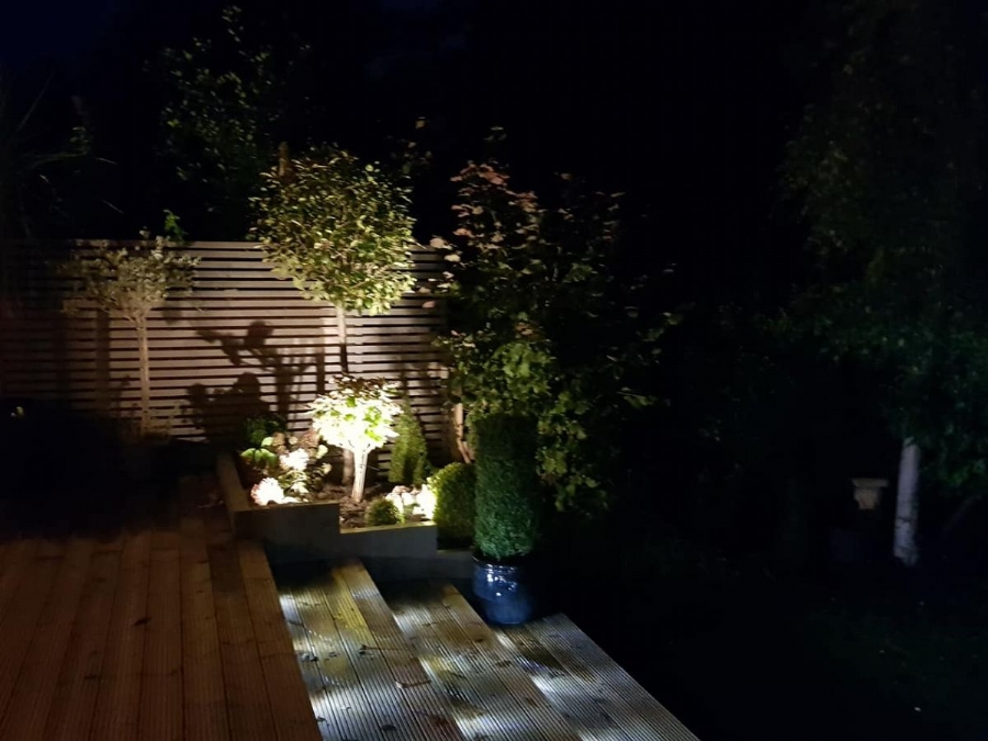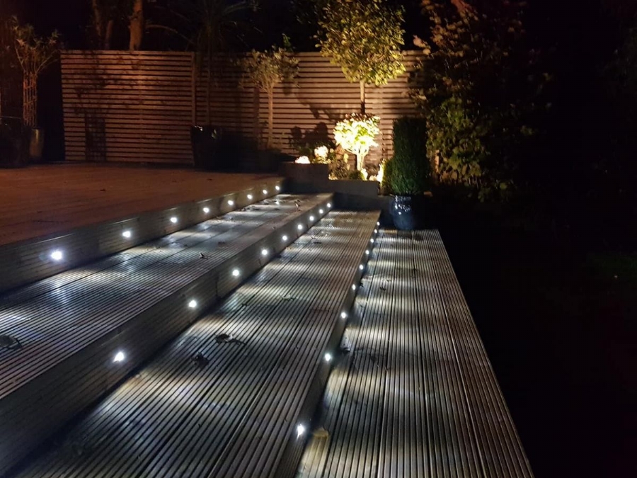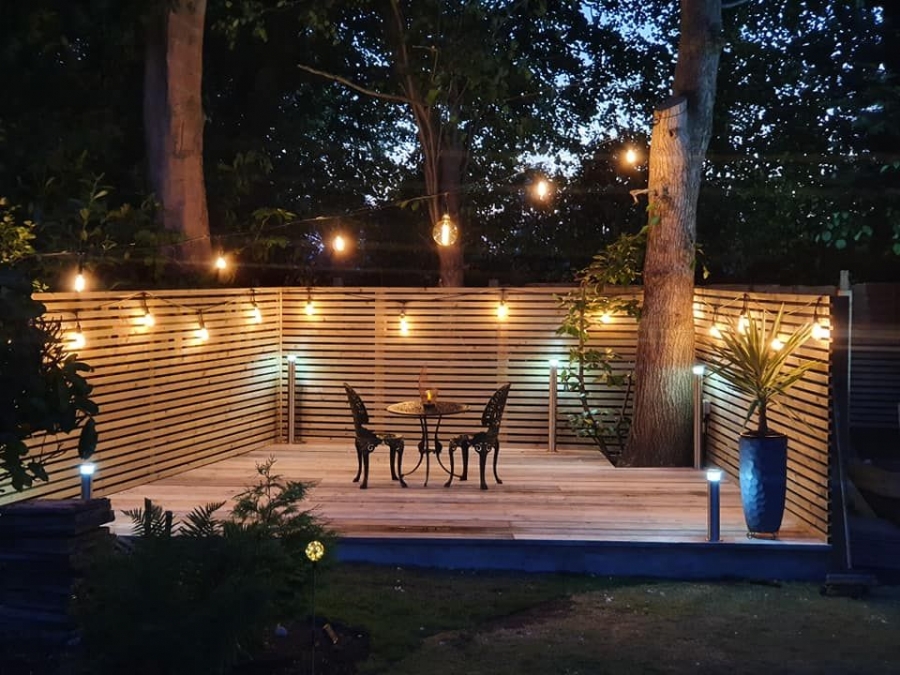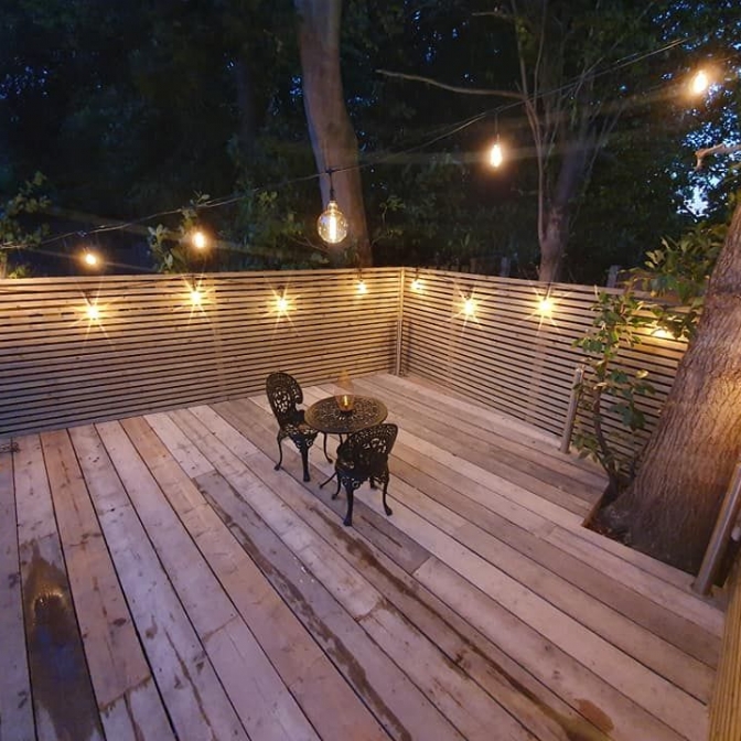 reclaimed scaffold board deck with batten fencing with warming lights.