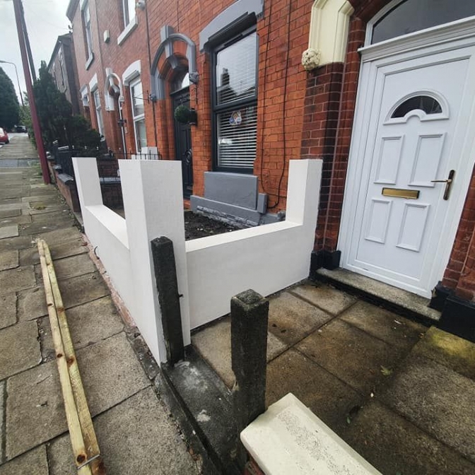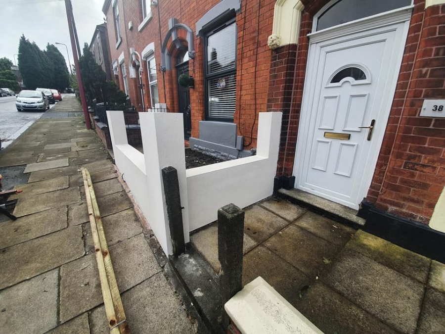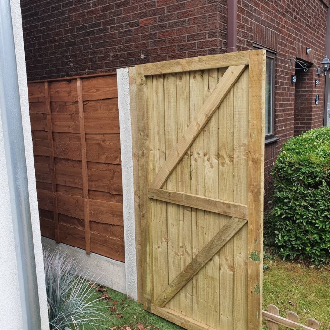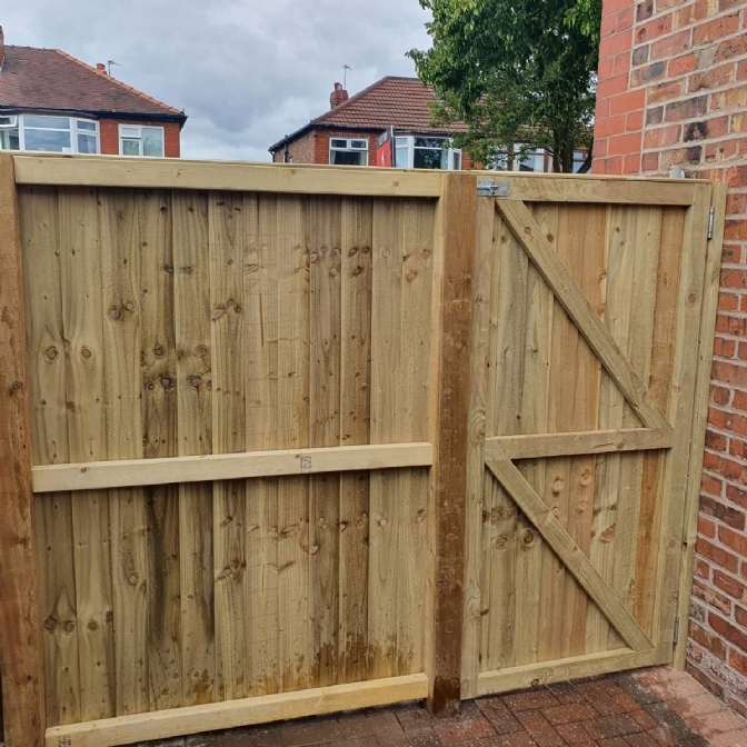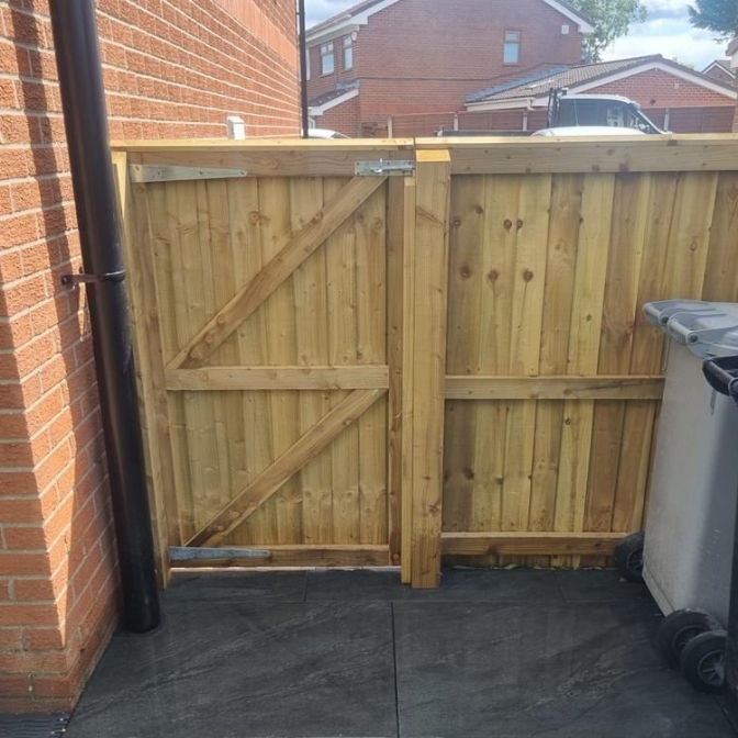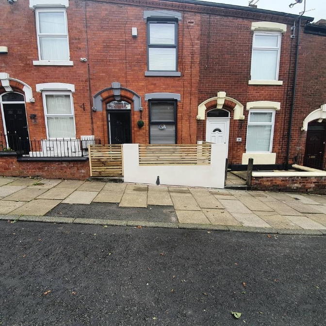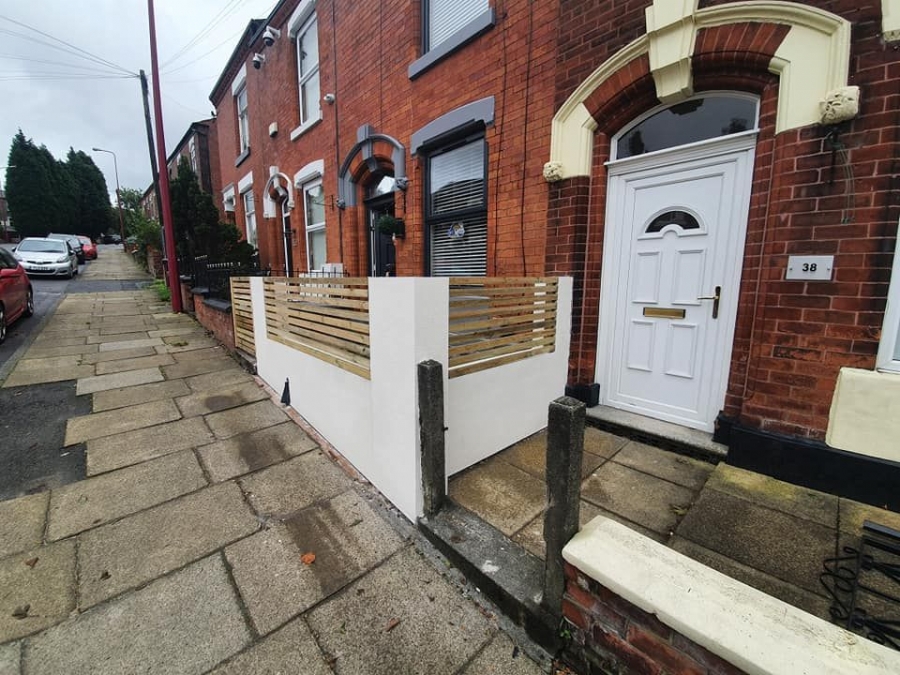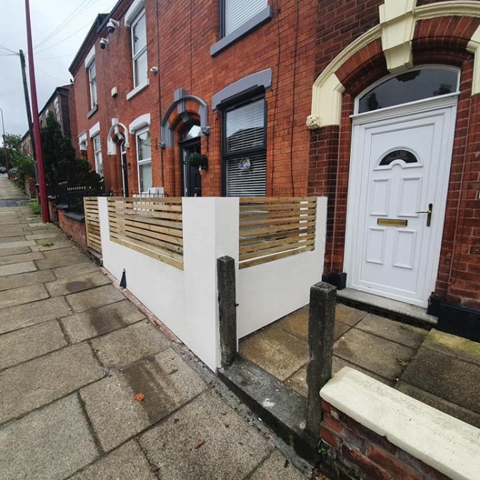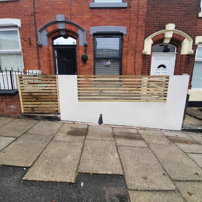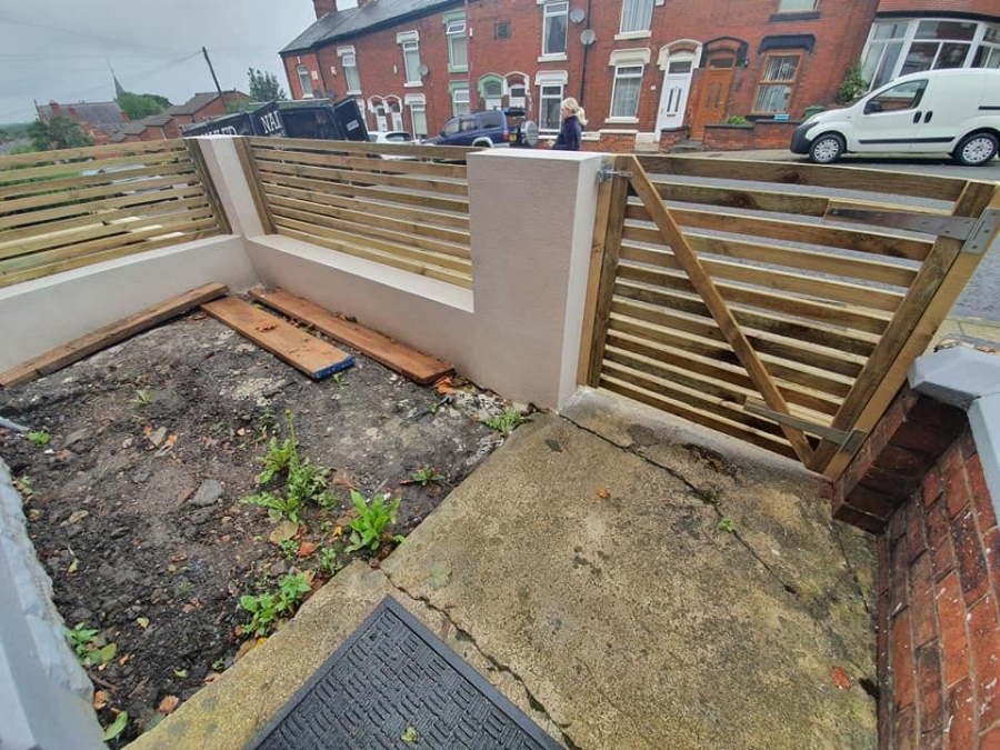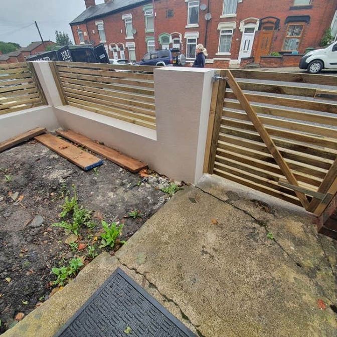 Nice batten fence and gate on a k rended wall in Ashton-under-Lyne